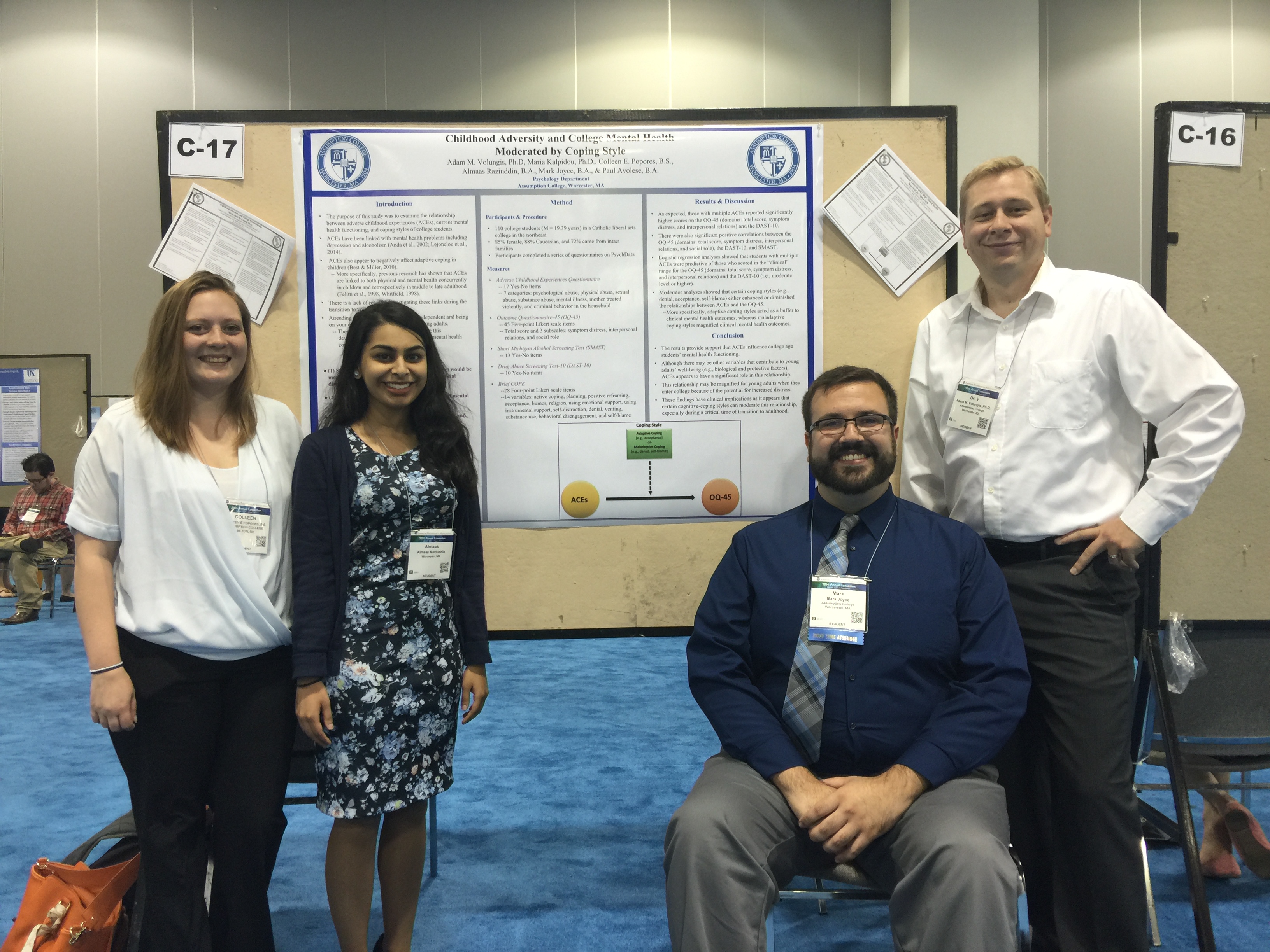 Volungis, A. M., Kalpidou, M., Popores-LaFleur, C., Raziuddin, A., Joyce, M., & Avolese, P. (2016,August). Childhood adversity and college mental health moderated by coping style. Poster presented at the 124th annual conference of the American Psychological Association, Denver, CO.