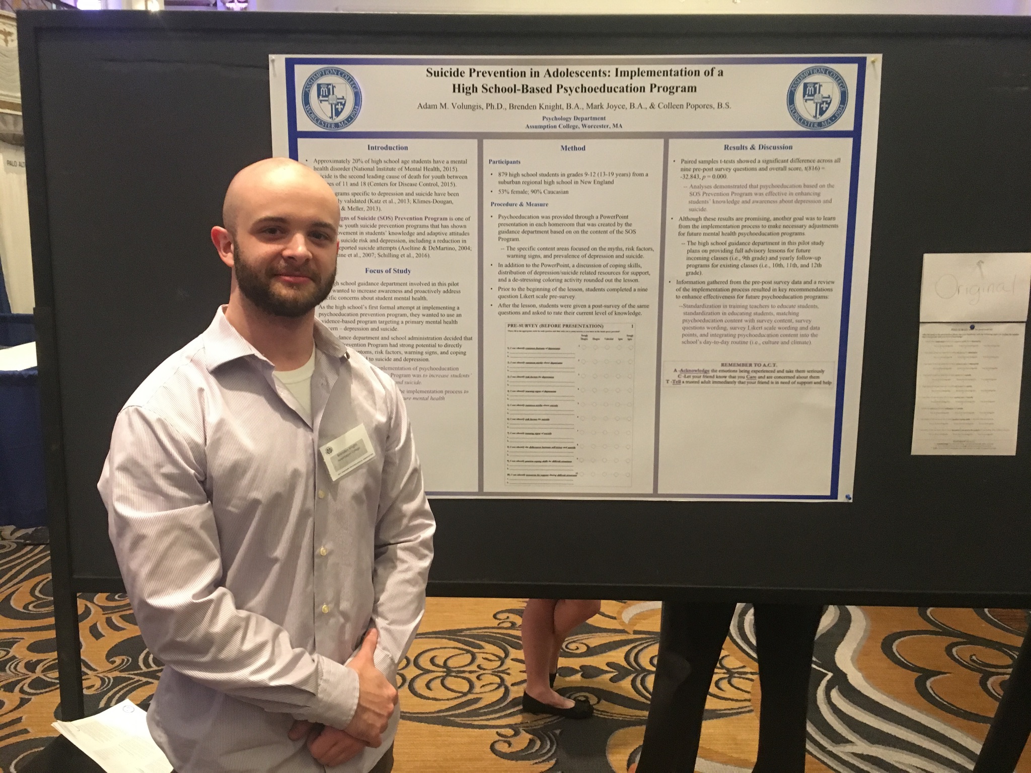 Volungis, A. M., Knight, B., Joyce, M., & Popores, C. (2017, March). Suicide prevention in adolescents: Implementation of a high school-based psychoeducation program. Poster presented at the 88th annual conference of the Eastern Psychological Association, Boston, MA.