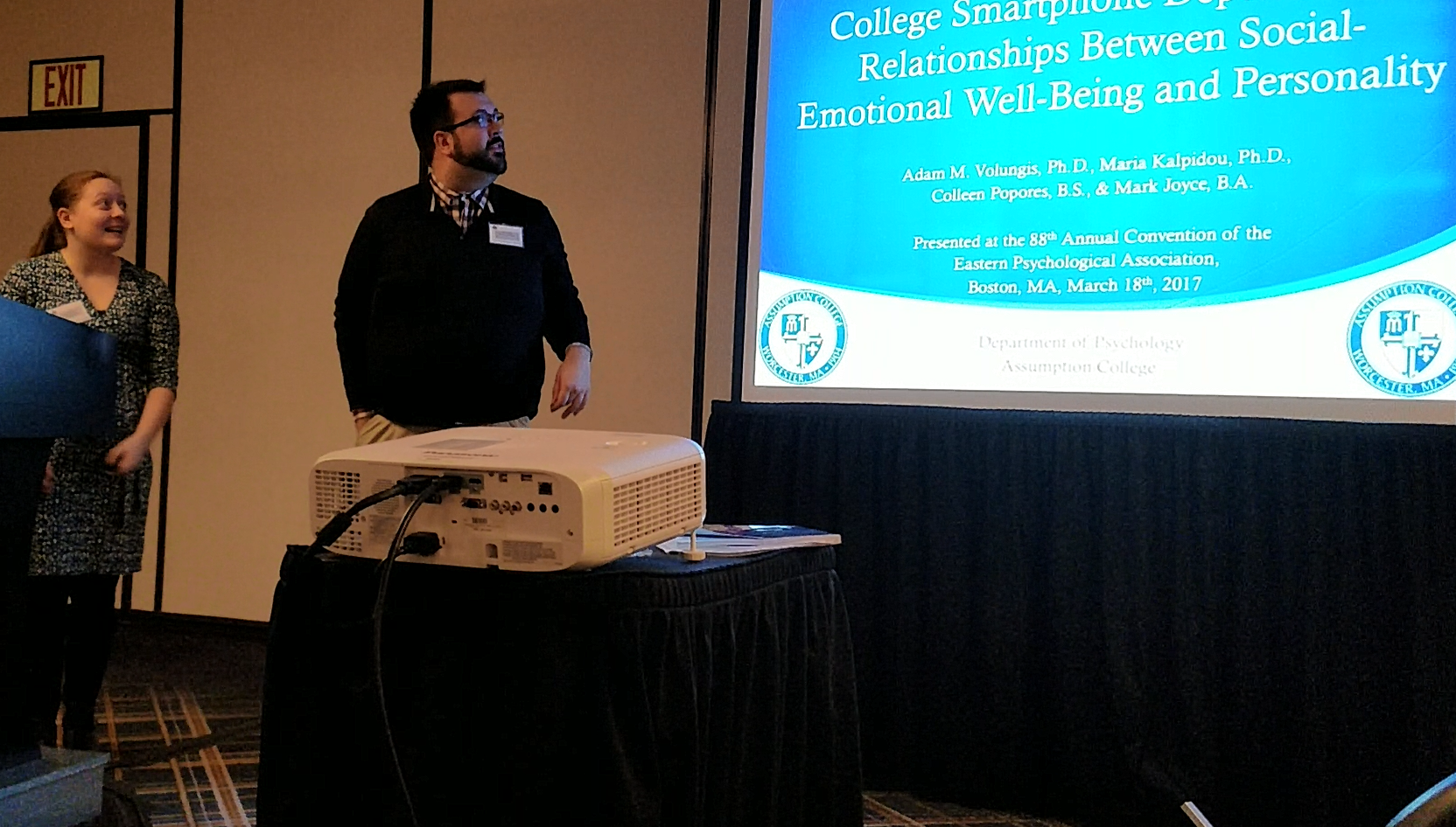 Volungis, A. M., Kalpidou, M., Popores, C., & Joyce, M. (2017, March). College student smartphone dependency: Relationships between social-emotional well-being and personality. Paper presented at the 88th annual conference of the Eastern Psychological Association, Boston, MA.